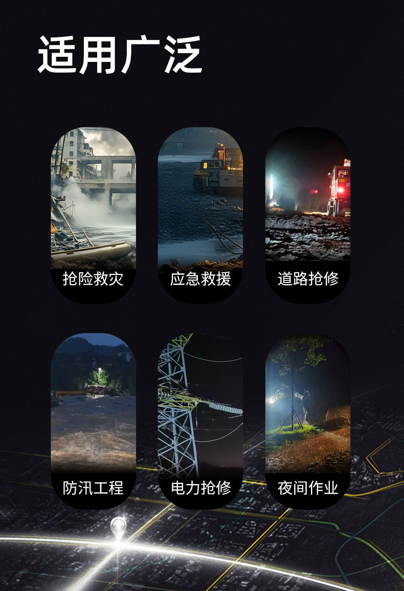 適用于維護(hù)搶修、事故處理、防汛抗洪、搶險(xiǎn)救災(zāi)等大面積照明。