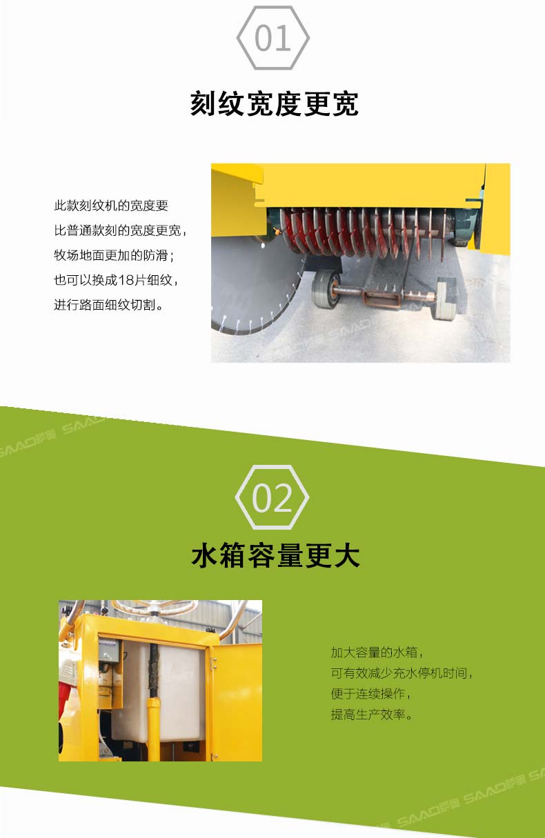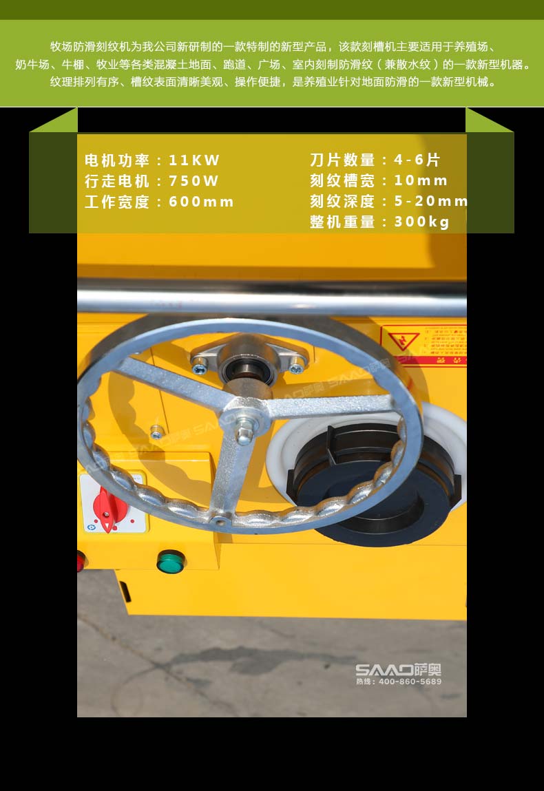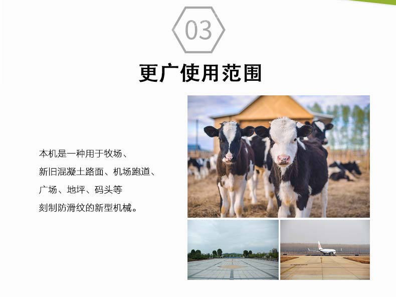牧場(chǎng)防滑刻紋機(jī)為我公司新研制的一款特制的新型產(chǎn)品,該款刻槽機(jī)主要適用于養(yǎng)殖場(chǎng)、奶牛場(chǎng)、牛棚、牧業(yè)等各類混凝土地面、跑道、廣場(chǎng)、室內(nèi)刻制防滑紋(兼散水紋)的一款新型機(jī)器。紋理排列有序、槽紋表面清晰美觀、操作便捷,是養(yǎng)殖業(yè)針對(duì)地面防滑的一款新型機(jī)械。