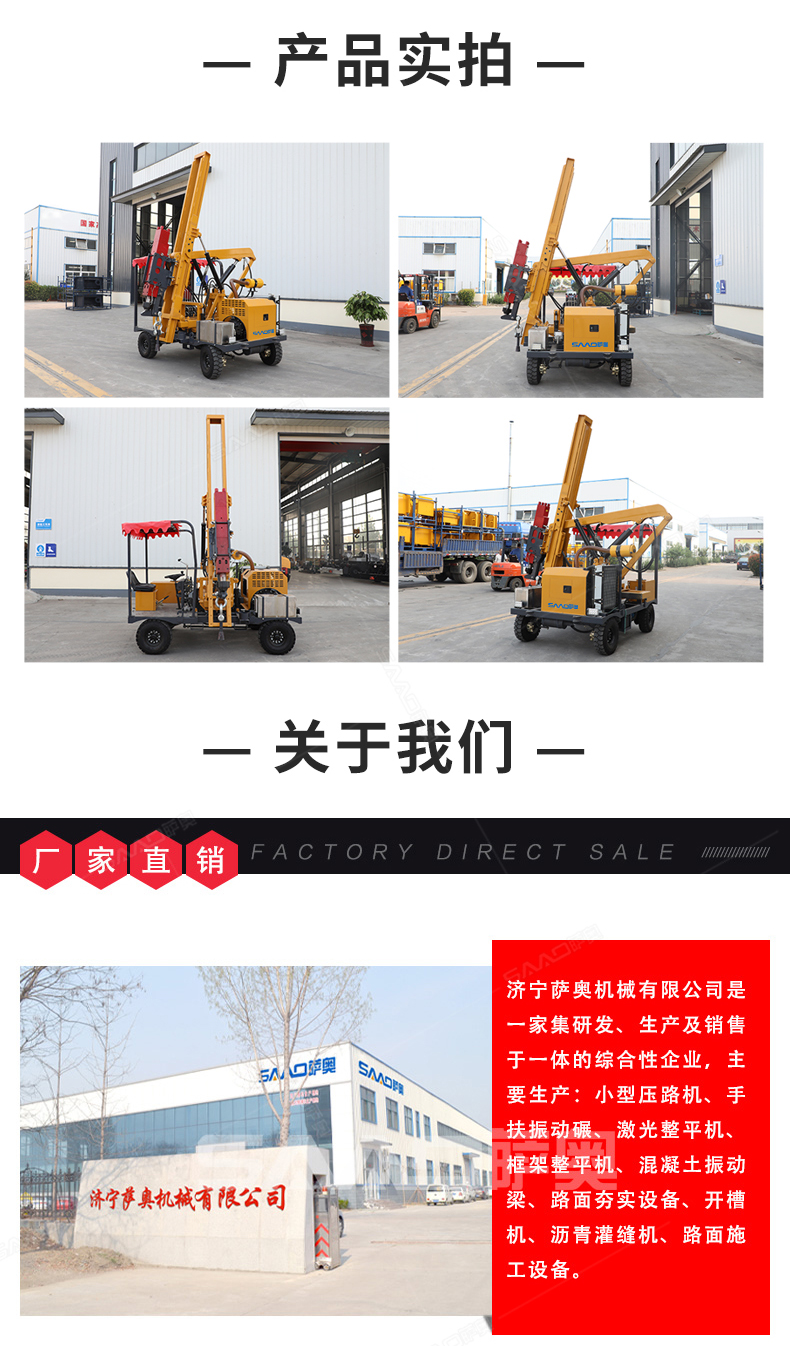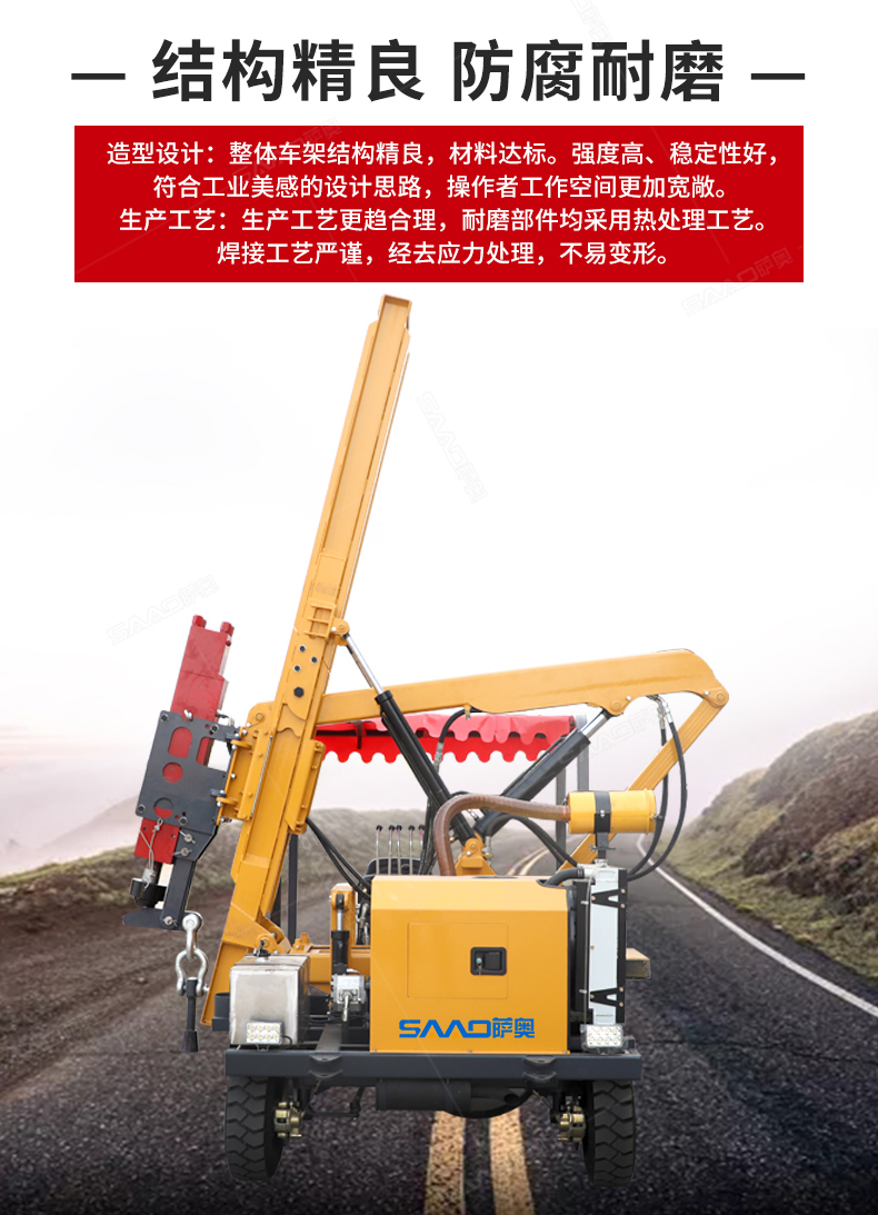小四輪打樁機(jī)是護(hù)欄打拔鉆一體機(jī)的同類產(chǎn)品,也是用于公路波形護(hù)欄的安裝。該機(jī)采用柴油動(dòng)力,全液壓機(jī)械傳動(dòng),具有行駛輕便、打樁精度高、經(jīng)久耐用、節(jié)能環(huán)保等特點(diǎn),特別適用于公路護(hù)欄安裝、維修和搶修的野外工程施工。