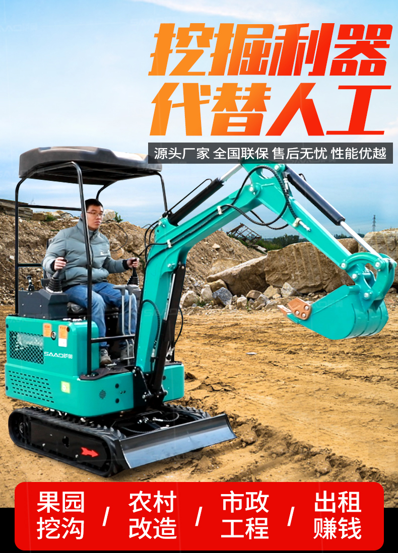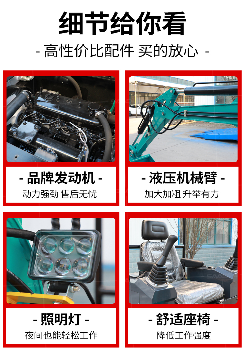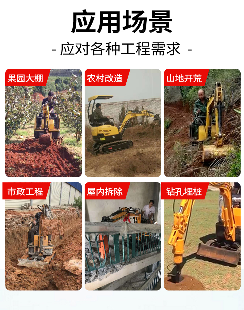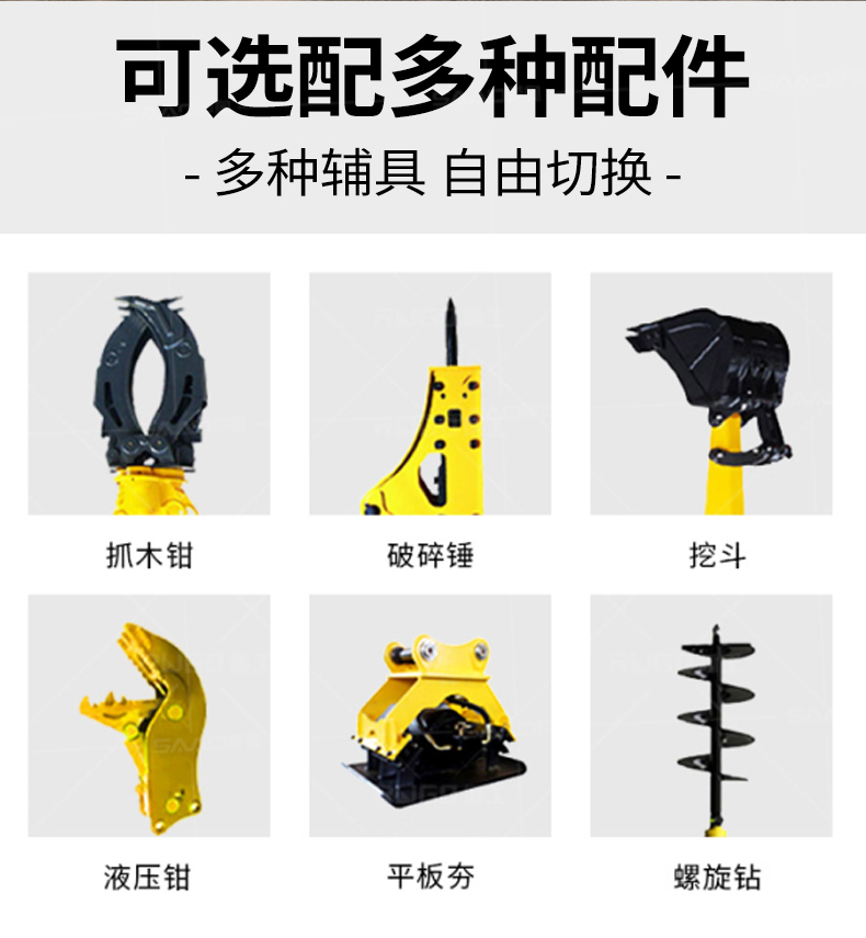 小型挖掘機(jī)可選配多種配件-多種輔具自由切換。