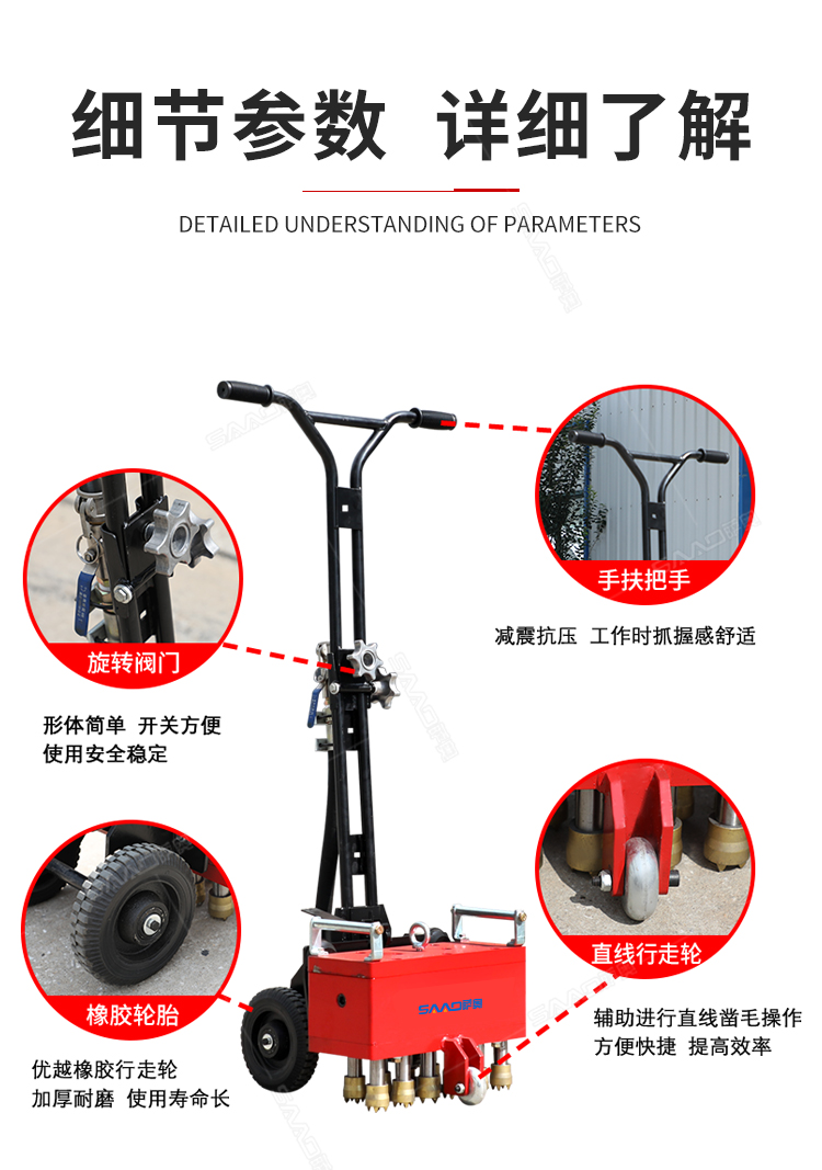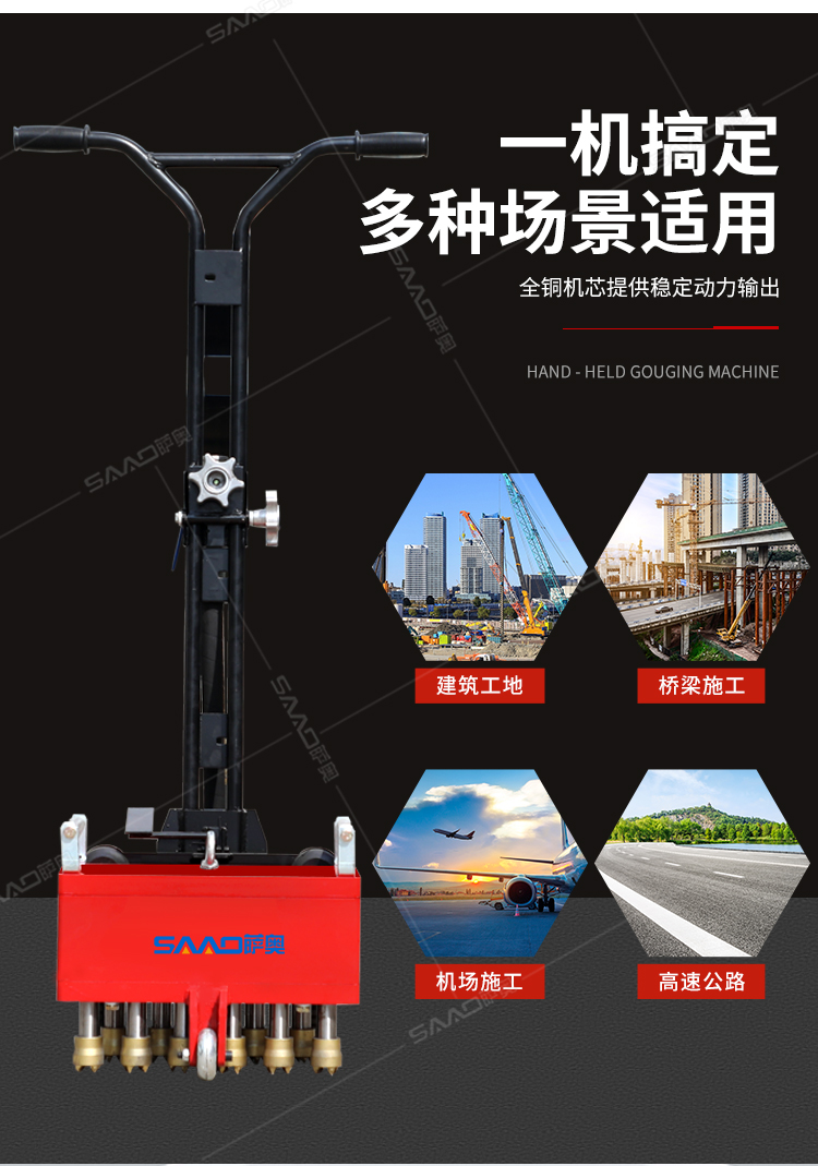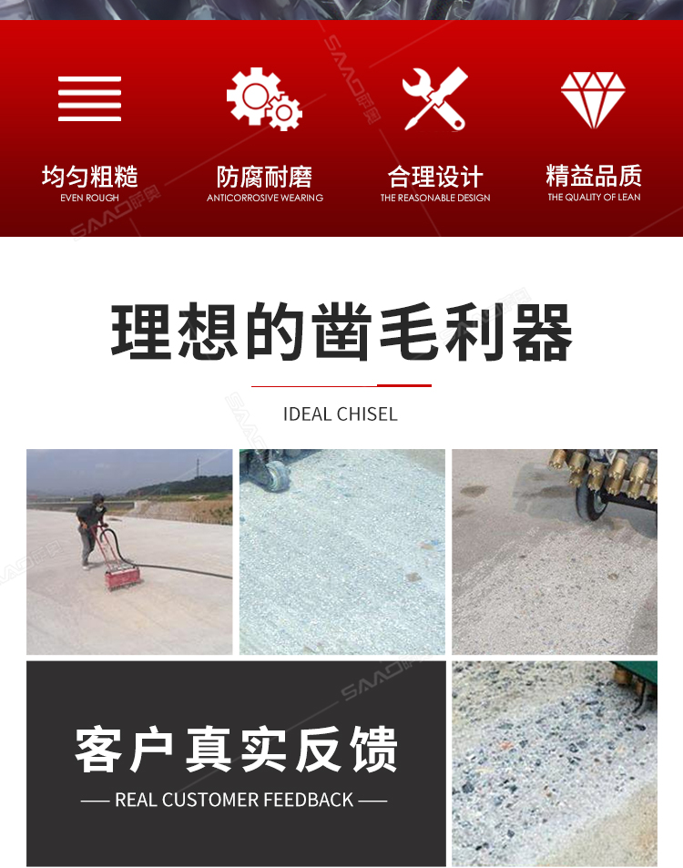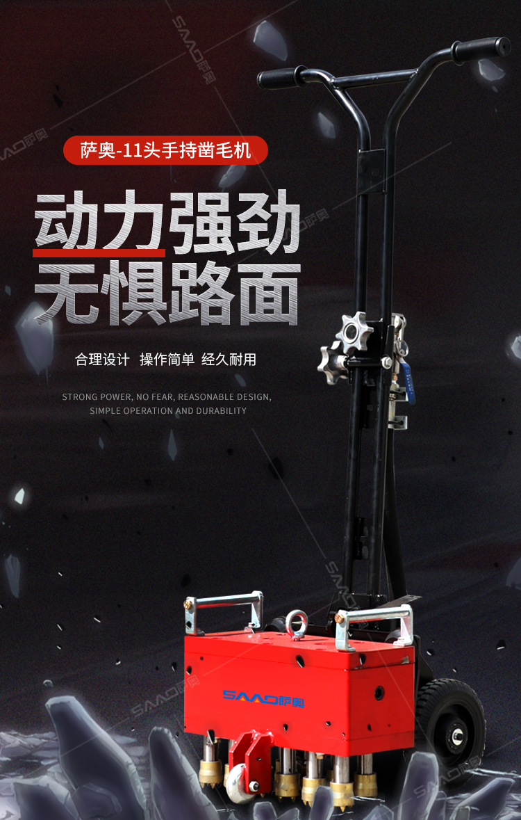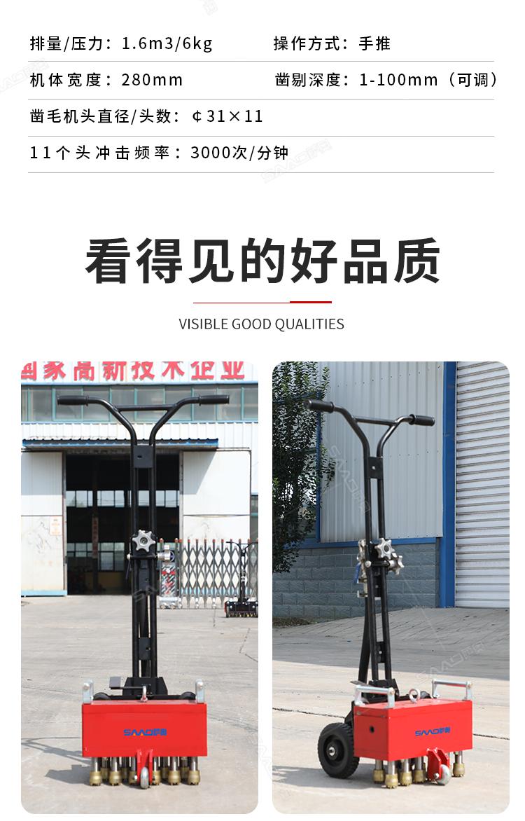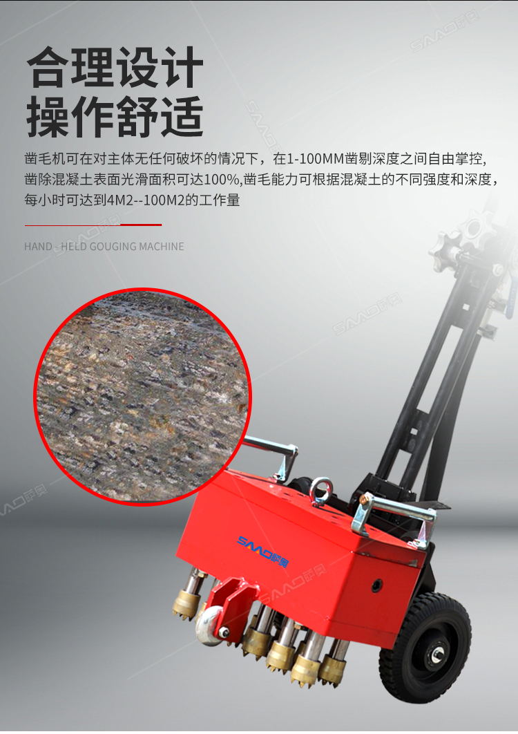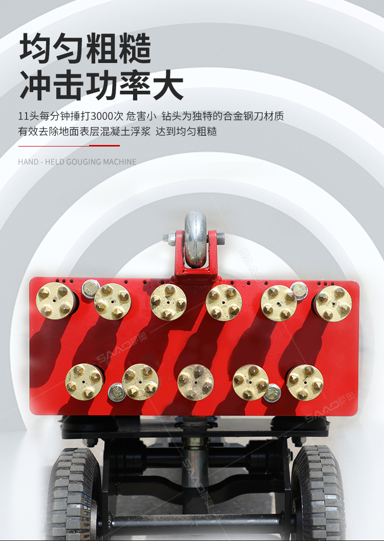 薩奧11頭鑿毛機 11頭鑿毛機的鑿頭有11個,它的鑿毛能力是指混凝土強度在C30-C40之間的參考 值,根據(jù)施工混凝土強度和鑿毛頭的鋒銳程度的不同,鑿毛效率會有所區(qū)別
