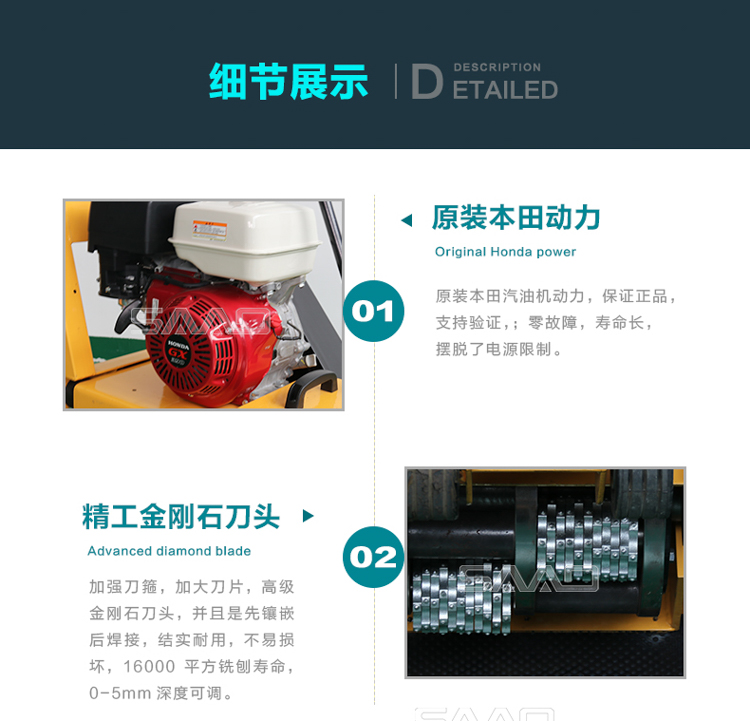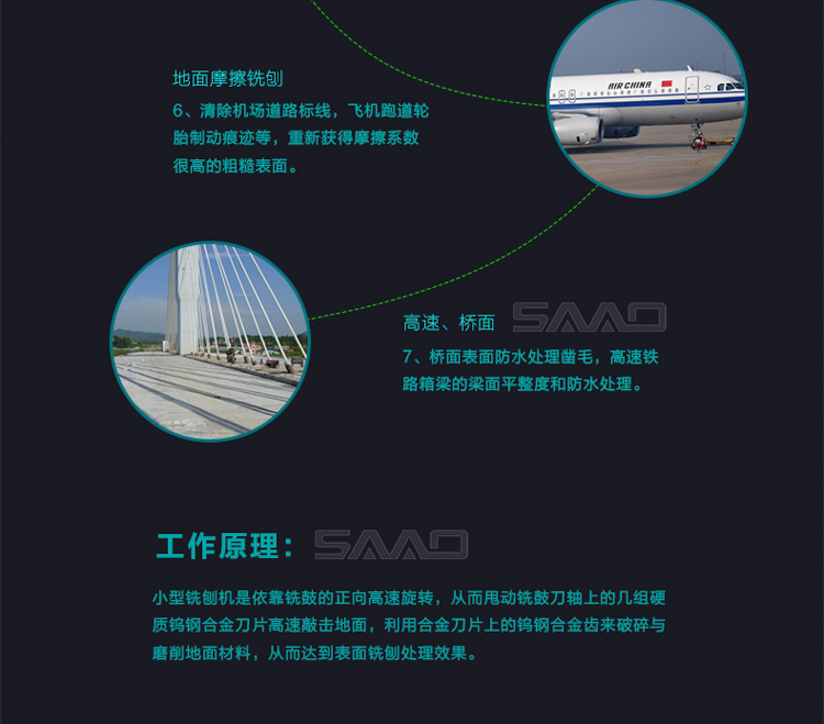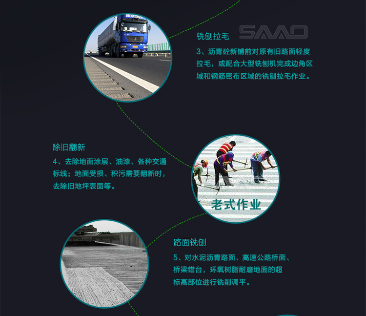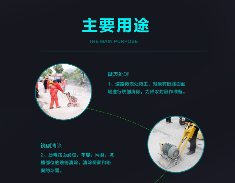 用于橋面鋪設(shè)瀝青或車間舊的混凝土地面重新攤鋪混凝土之前,清除水泥浮漿以及鏟平拉毛,也用于清除建筑施工中遺留的堅(jiān)硬灰渣。