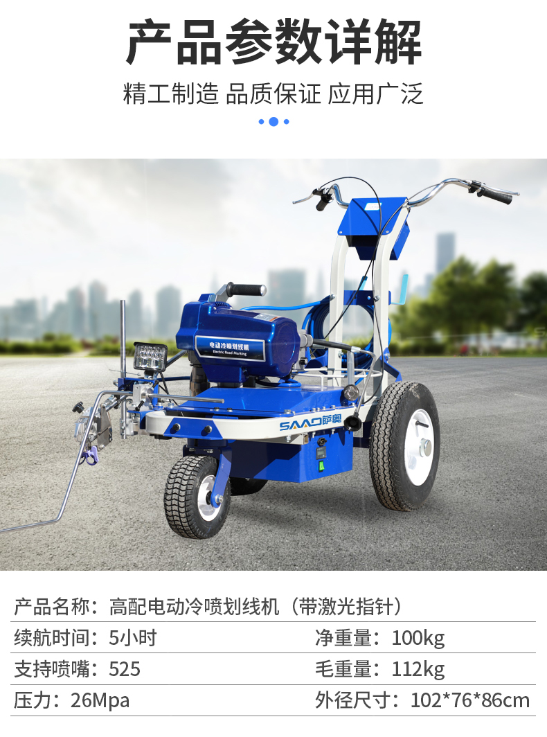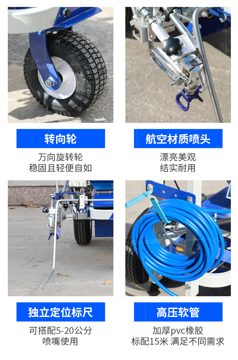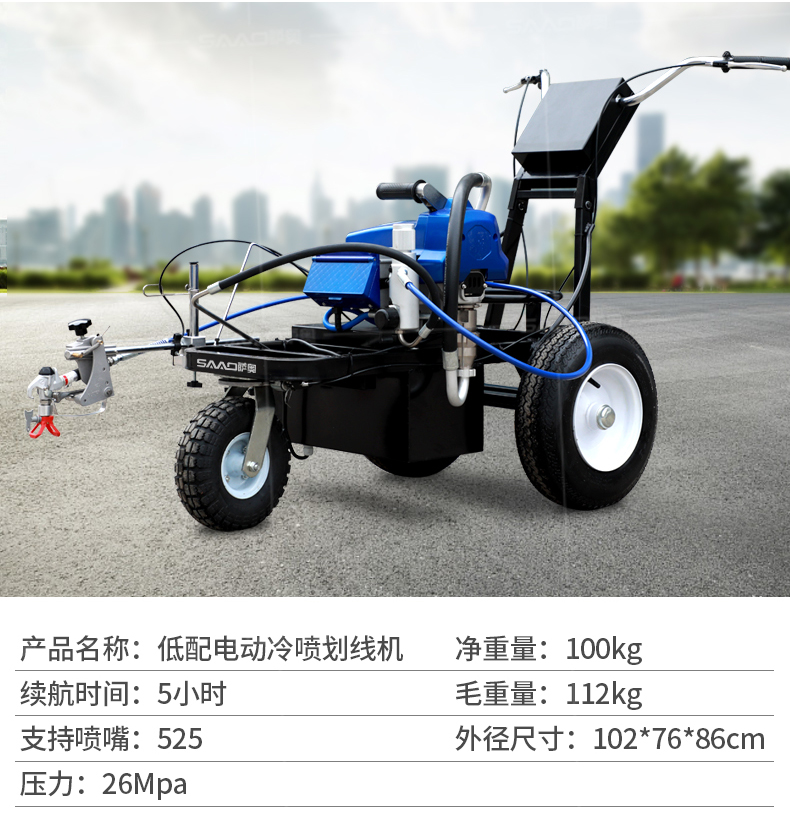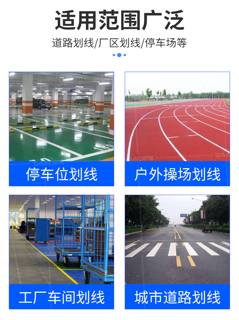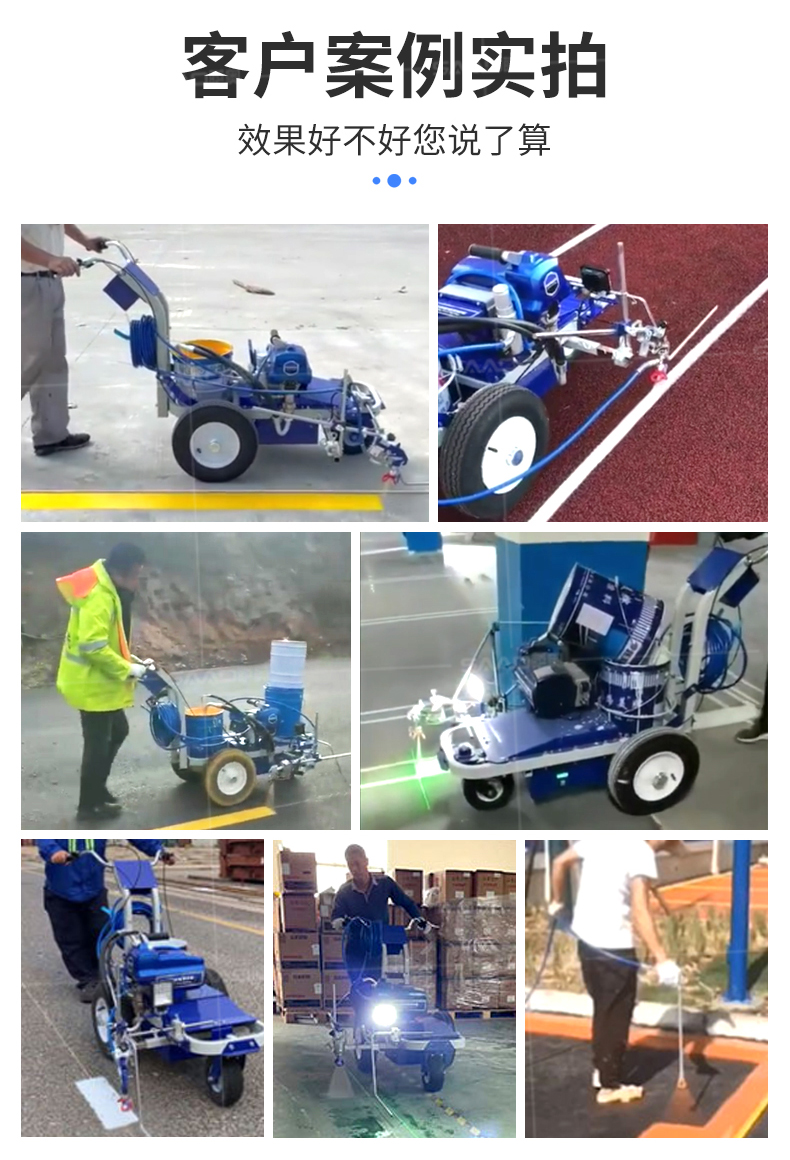 【產(chǎn)品介紹】 小區(qū)物業(yè)、地下車庫(kù)、學(xué)校、加油站、駕校場(chǎng)地等噴涂工作量不是特別大的客戶 【產(chǎn)品優(yōu)勢(shì)】 持久續(xù)航,運(yùn)行穩(wěn)定,劃線筆直,無噪音。 真空氣輪:減震效果更為顯著平