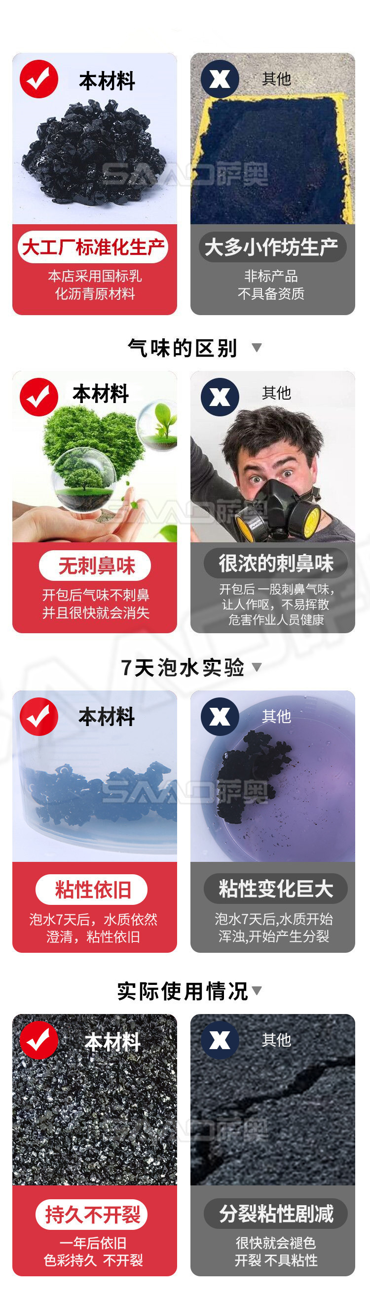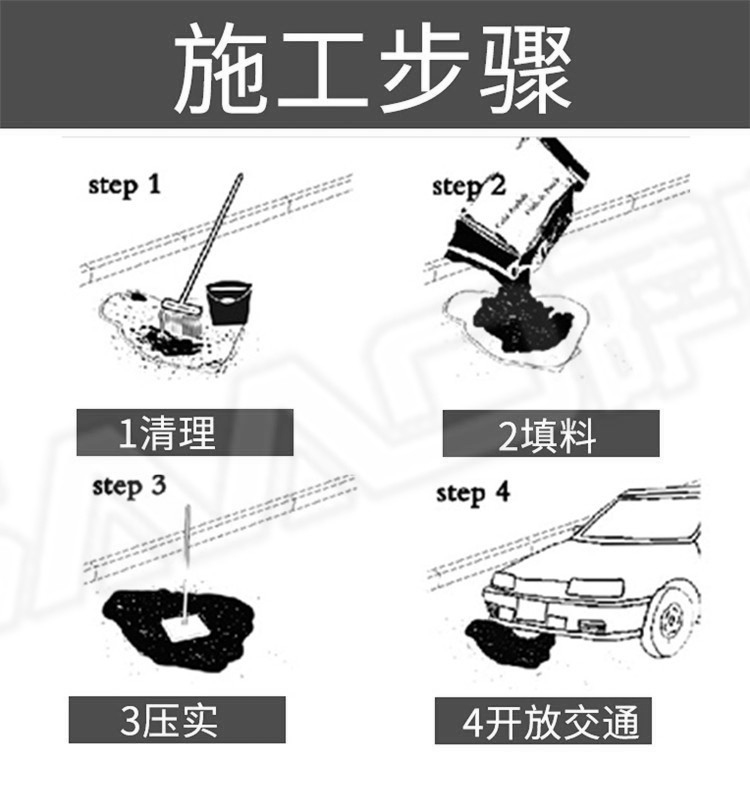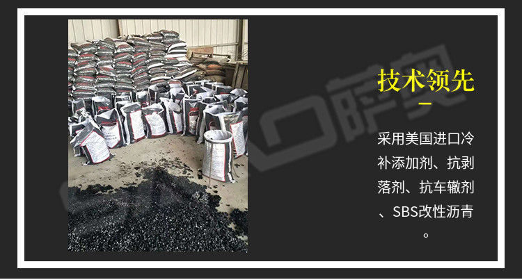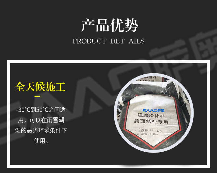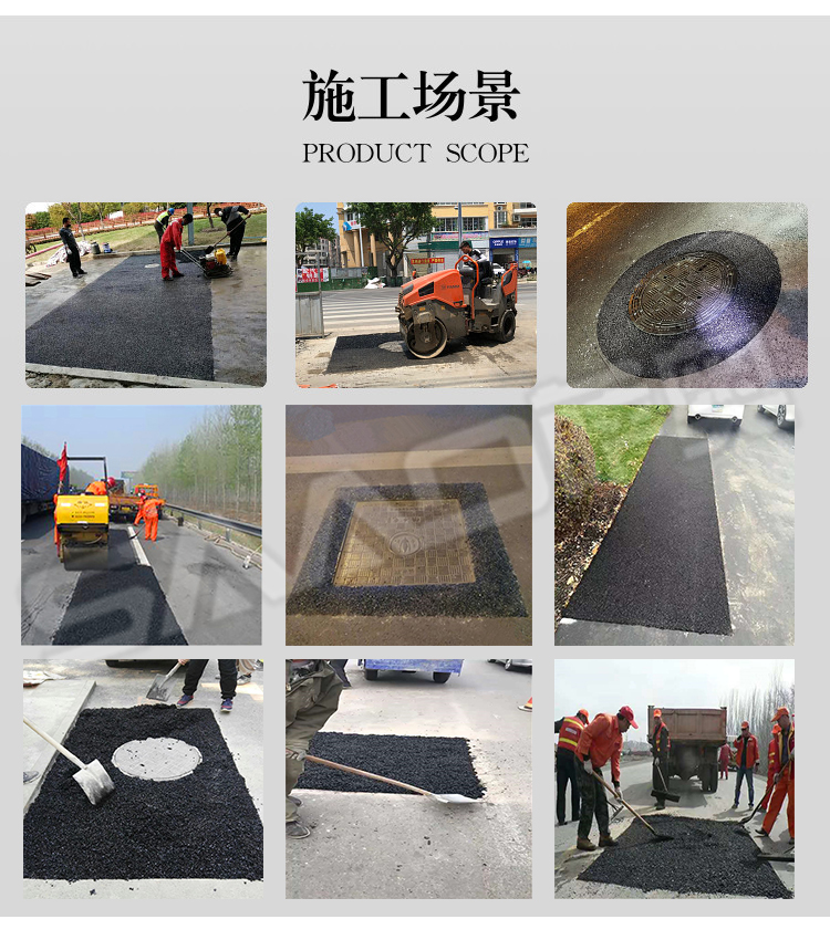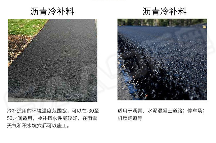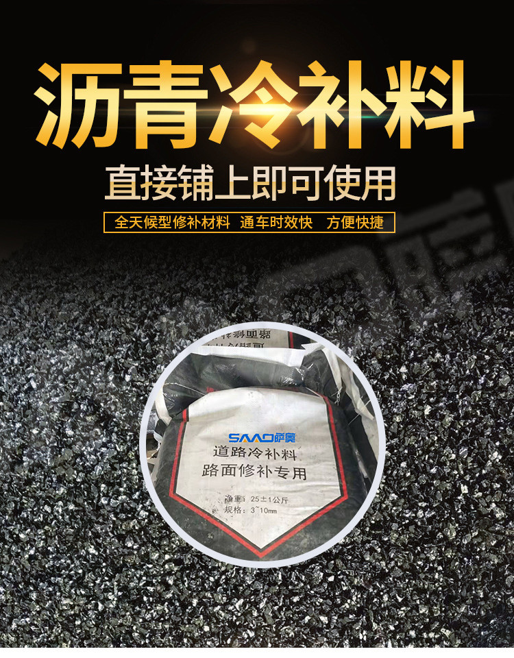 冷補(bǔ)料是采用特殊的方法改質(zhì)瀝青,使得瀝青具的粘結(jié)性,感壓性和粘彈性,在適當(dāng)壓實(shí)之后,能夠長(zhǎng)久的粘在修補(bǔ)處不脫落。冷補(bǔ)料以其可以在全天候條件下修補(bǔ)路面,操作簡(jiǎn)便,修補(bǔ)質(zhì)量好,存放長(zhǎng)久,節(jié)省費(fèi)用等諸多優(yōu)點(diǎn),已被廣泛的應(yīng)用于各省市道路路面修補(bǔ)且日益受到道路養(yǎng)護(hù)部門的認(rèn)可和歡迎。冷補(bǔ)適用的環(huán)境溫度范圍寬,可以在-30至50之間適用,在雨雪天氣和積水坑穴都可以施工。
