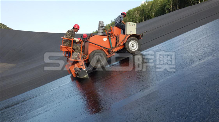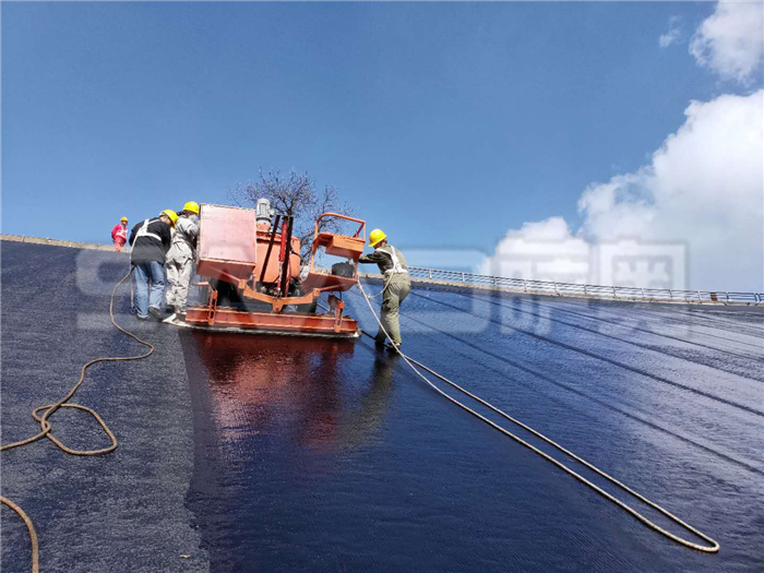 瀝青封閉層的施工采用適合于斜坡施工的專用瀝青瑪蹄脂涂刷機(jī),在牽引臺(tái)車的牽引下沿著面板從下往上涂刷。涂刷完一個(gè)條帶后,將涂刷機(jī)移動(dòng)至下一個(gè)條帶繼續(xù)涂刷?,斕阒忾]層涂刷作業(yè)時(shí)環(huán)境氣溫應(yīng)在10℃以上,涂刷溫度一般在170℃~190℃;施工完成的封閉層表面禁止無關(guān)人員和機(jī)械行走;特殊部位:壩頂及曲率半徑較小的圓弧斷,采用小型機(jī)械涂刷方式進(jìn)行機(jī)械涂刷進(jìn)行,環(huán)庫(kù)水平段及弧段全部采用小刮涂機(jī)配合人工進(jìn)行刮涂施工。