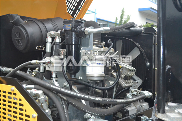 潤(rùn)滑油缸座與鉸接架時(shí)需轉(zhuǎn)動(dòng)方向盤(pán)以暴露全部油嘴,此時(shí)操作人員絕對(duì)不許靠近鉸接架。只有待停熄發(fā)動(dòng)機(jī)后并加以制動(dòng),才可以近前加油。