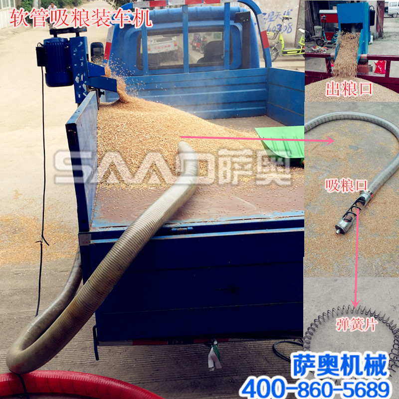 答:是螺旋式的,軟管里面有軟螺旋,高速旋轉把糧食提上來。管是軟的不會對糧食造成損傷。