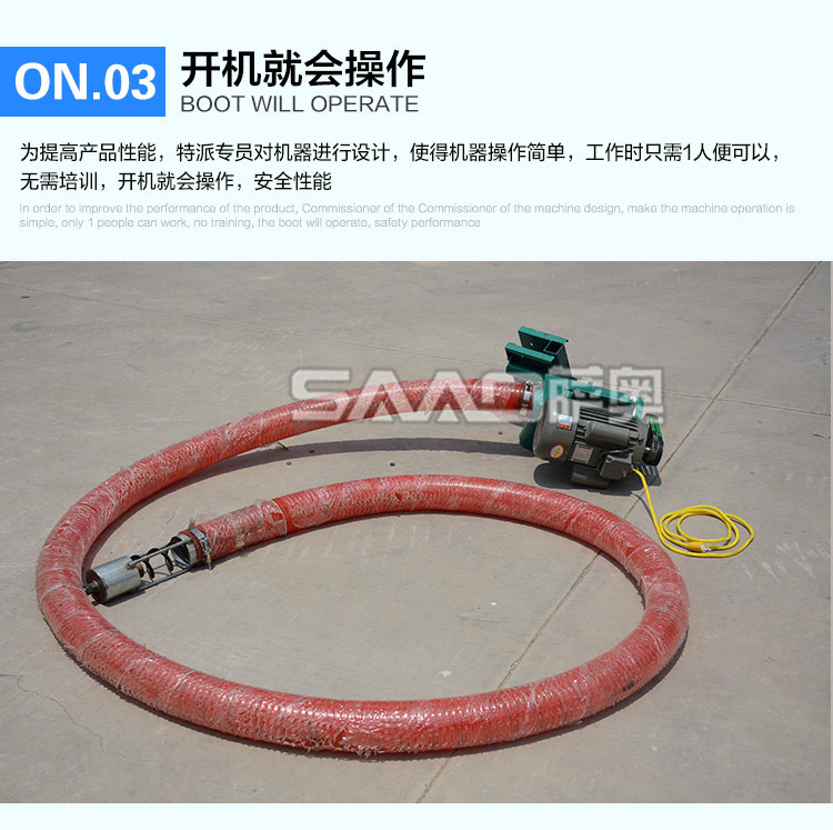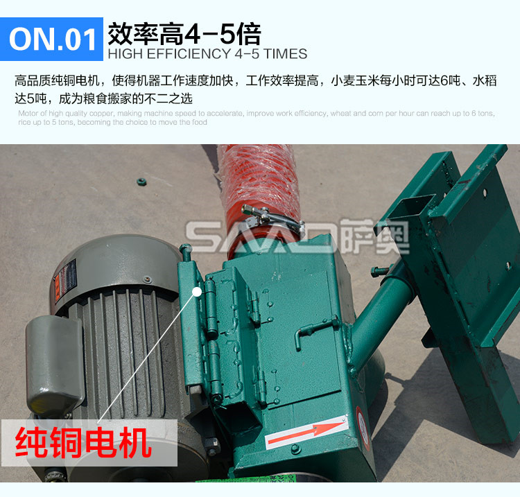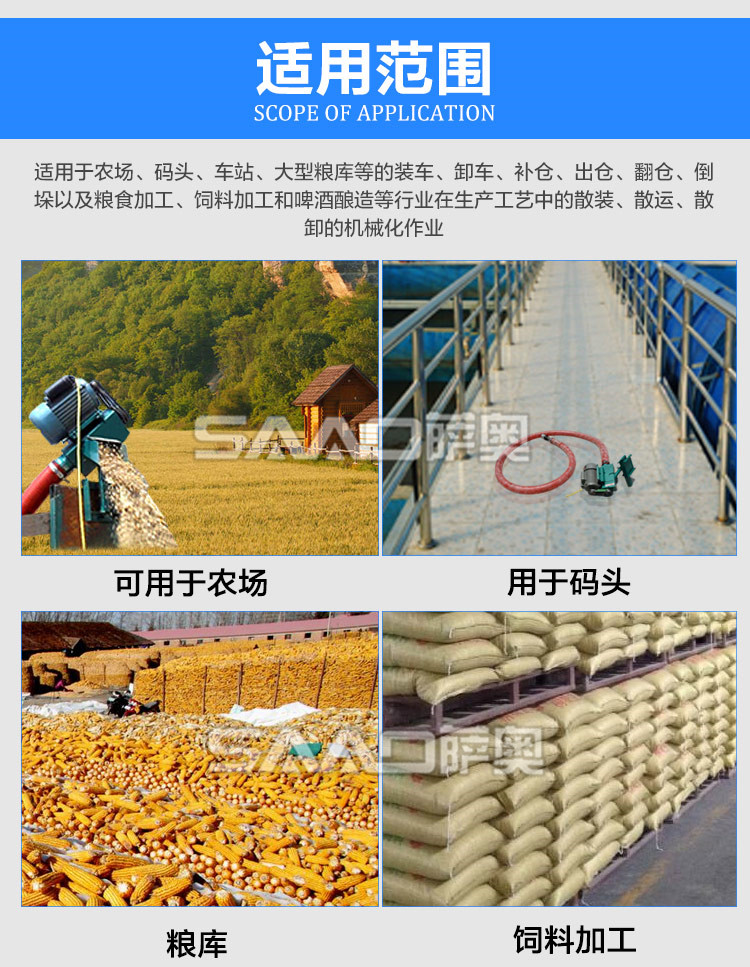 車載小型吸糧機是專門為農(nóng)村運糧、裝車、倒垛、倉儲而設計 的一種小型設備,具有體積小、重量輕、便于移動、吸糧效率高、破損率低,使用場合廣泛,安全可靠等特點,非常適合個體農(nóng)戶,糧食專業(yè)戶及農(nóng)業(yè)合作社使用。亦可以用在養(yǎng)殖場,飼料廠、食品廠、塑料廠等輸送顆料的場合。