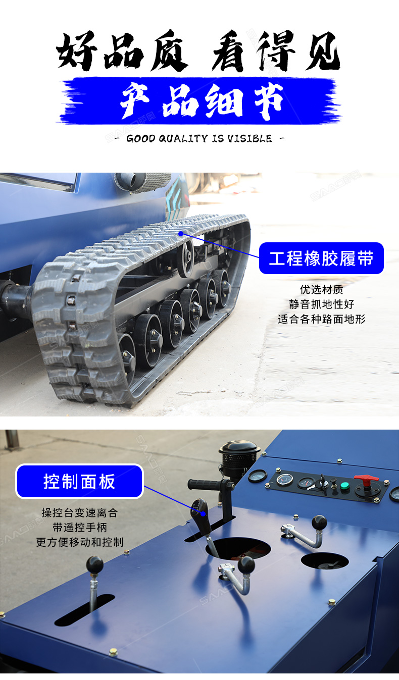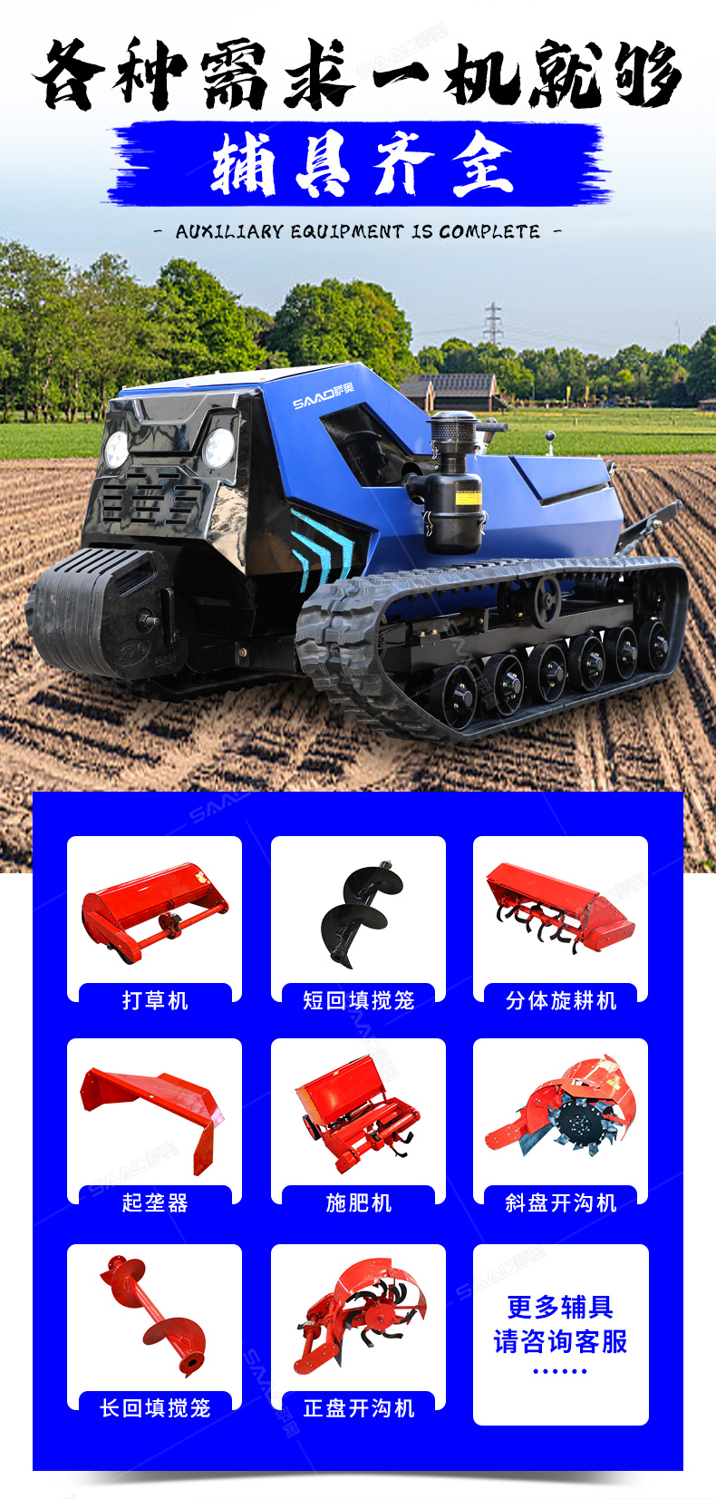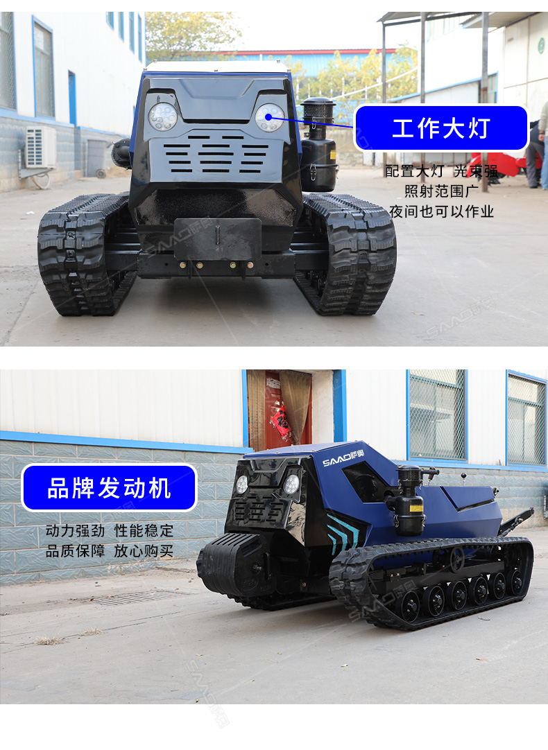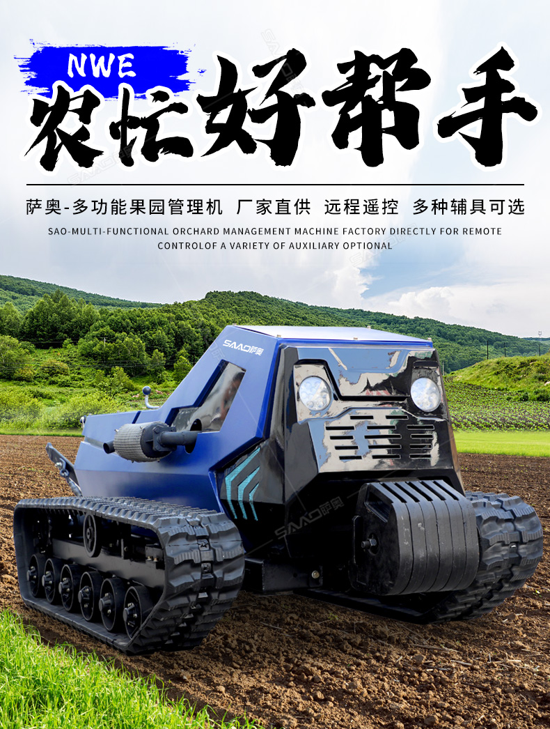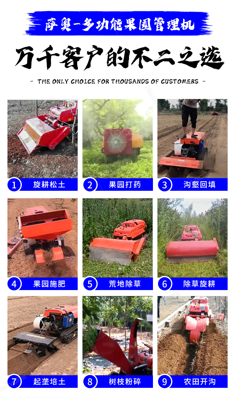 本產(chǎn)品采用履帶式驅(qū)動(dòng)設(shè)計(jì),穩(wěn)定性和爬坡能力較強(qiáng),適應(yīng)丘陵山地平原各種地形,機(jī)型小功率大,適應(yīng)各種行距的果樹(shù),大棚,園林。產(chǎn)品動(dòng)力強(qiáng)勁,結(jié)實(shí)耐用,性能優(yōu)越,安全放心,遠(yuǎn)程操控,省心省力。
