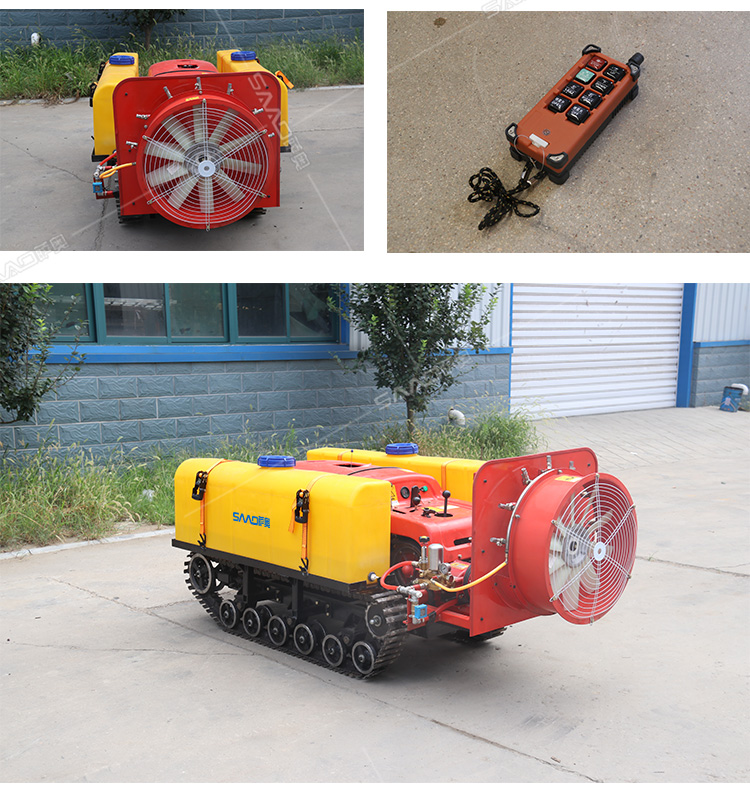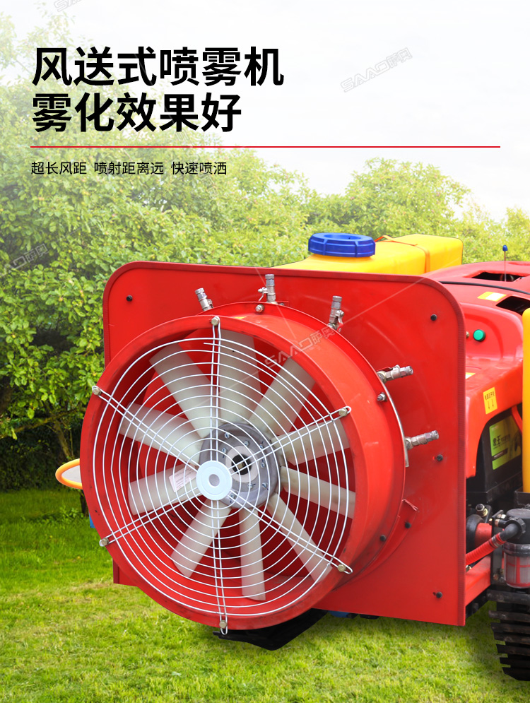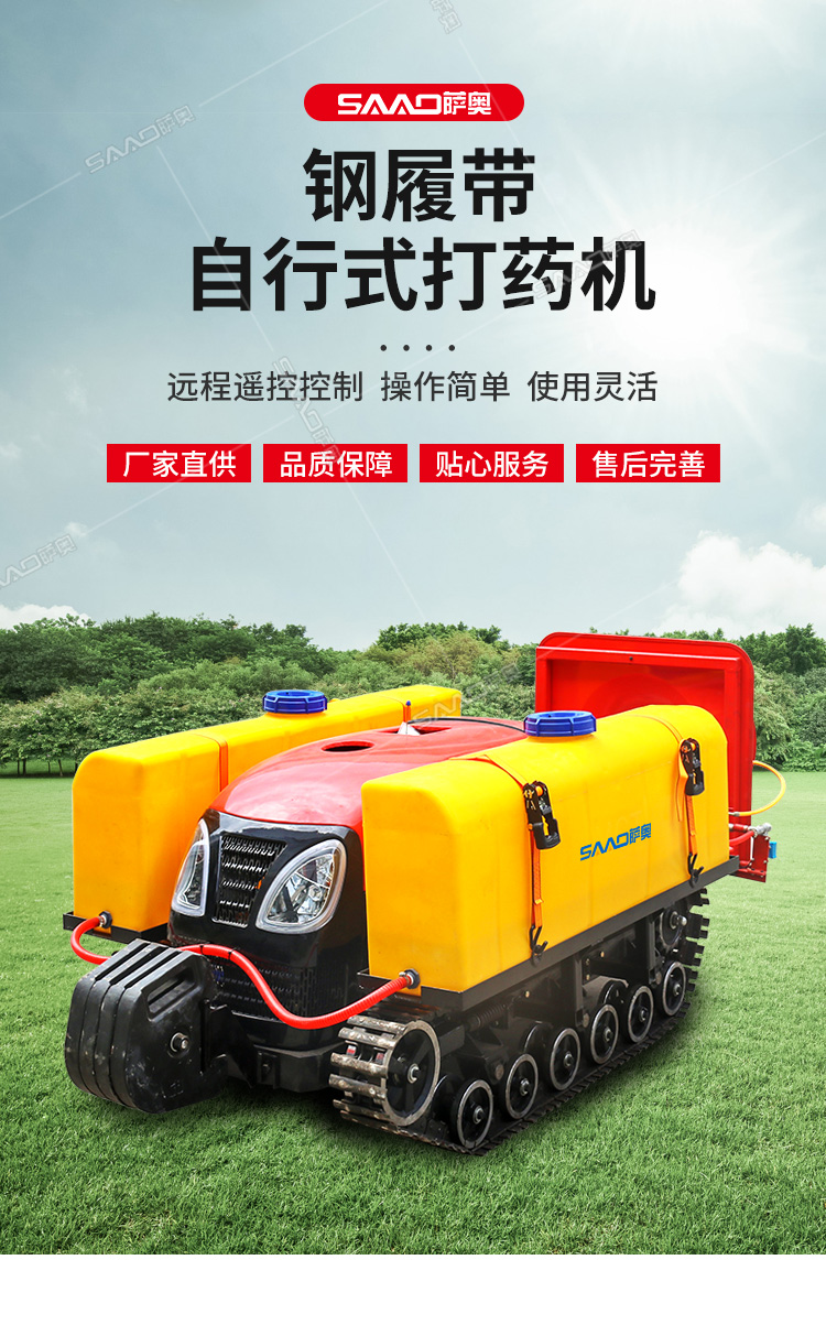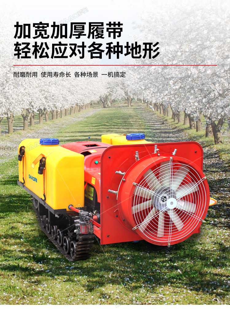28馬力鋼履帶自行式打藥機(jī),風(fēng)送式噴霧機(jī),霧化好,噴射距離遠(yuǎn);遙控操作,人機(jī)分離,確保作業(yè)人員安全,免受藥霧傷害。