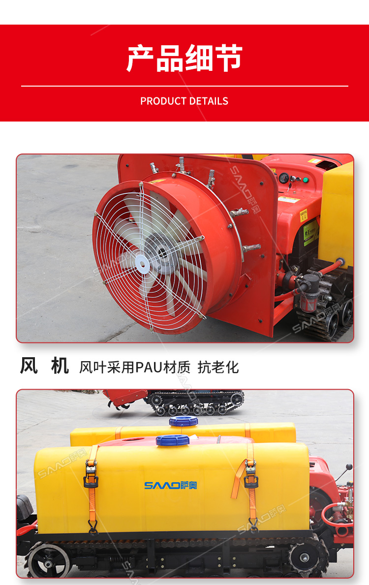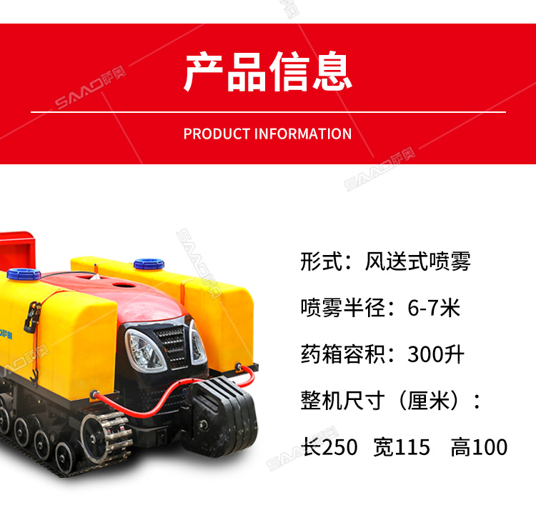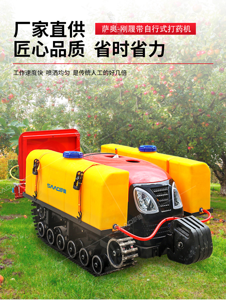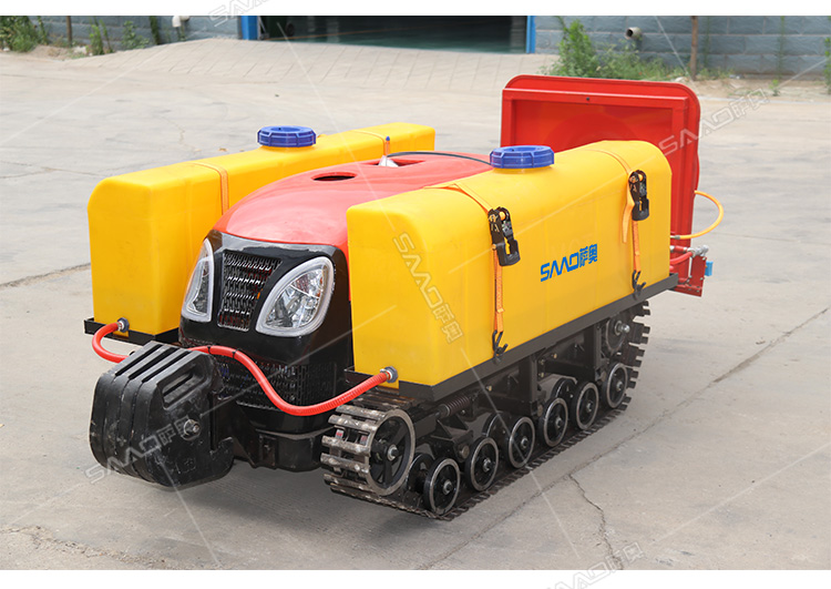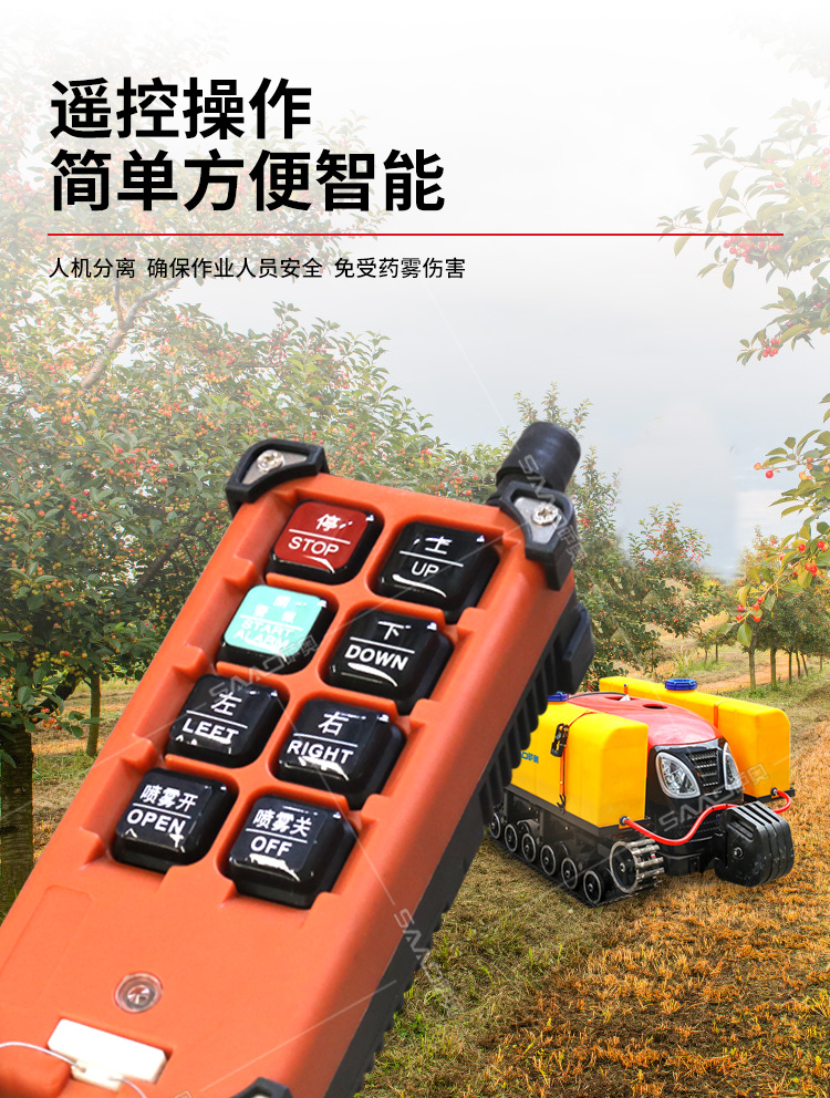 28馬力鋼履帶自行式打藥機(jī),風(fēng)送式噴霧機(jī),霧化好,噴射距離遠(yuǎn);遙控操作,人機(jī)分離,確保作業(yè)人員安全,免受藥霧傷害。