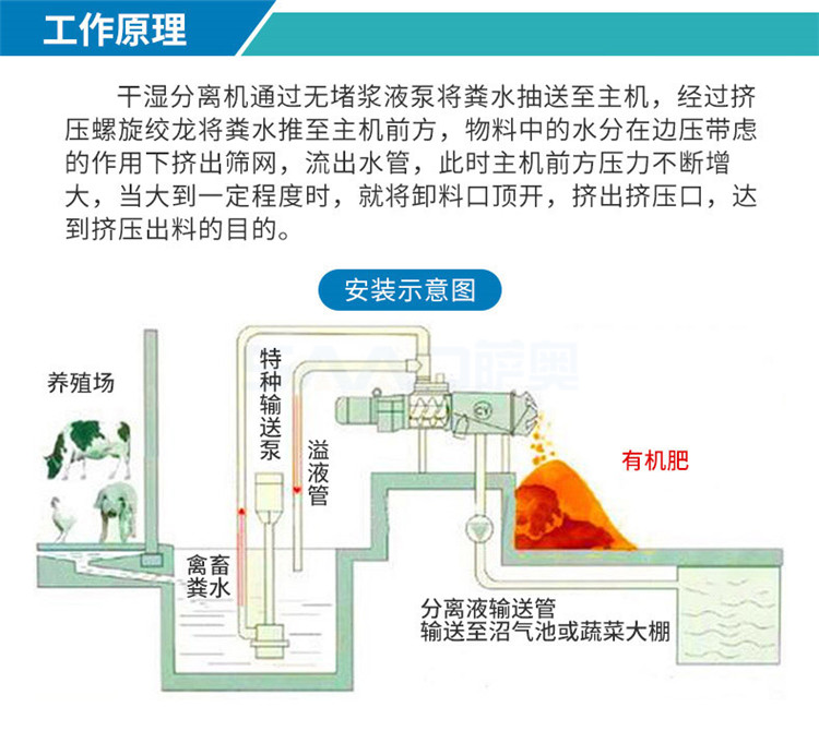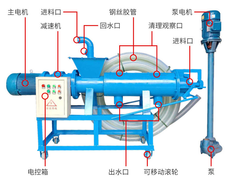 禽畜類糞便處理機(jī)能將雞糞、牛糞、豬糞等禽畜糞便原糞水分離為液態(tài)有機(jī)肥和固態(tài)有機(jī)肥。液態(tài)有機(jī)肥可直接用于農(nóng)作物利用吸收,固態(tài)有機(jī)肥可運(yùn)到缺肥地區(qū)使用,也可起到改善土壤結(jié)構(gòu)的作用,同時(shí)經(jīng)過發(fā)酵可制成有機(jī)復(fù)合肥。用泥漿泵將原糞水送至機(jī)內(nèi),通過安置在篩網(wǎng)中的螺旋軸,擠壓分離出固態(tài)物質(zhì),液體則通過篩網(wǎng)從出液口流出。