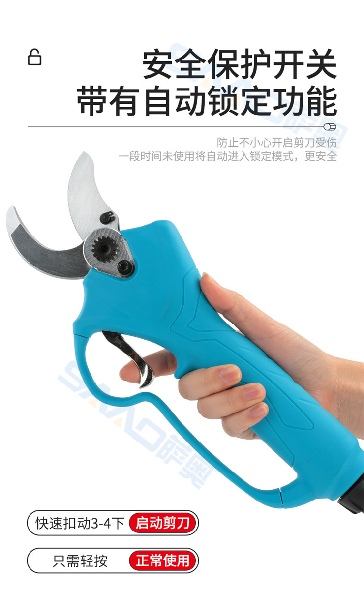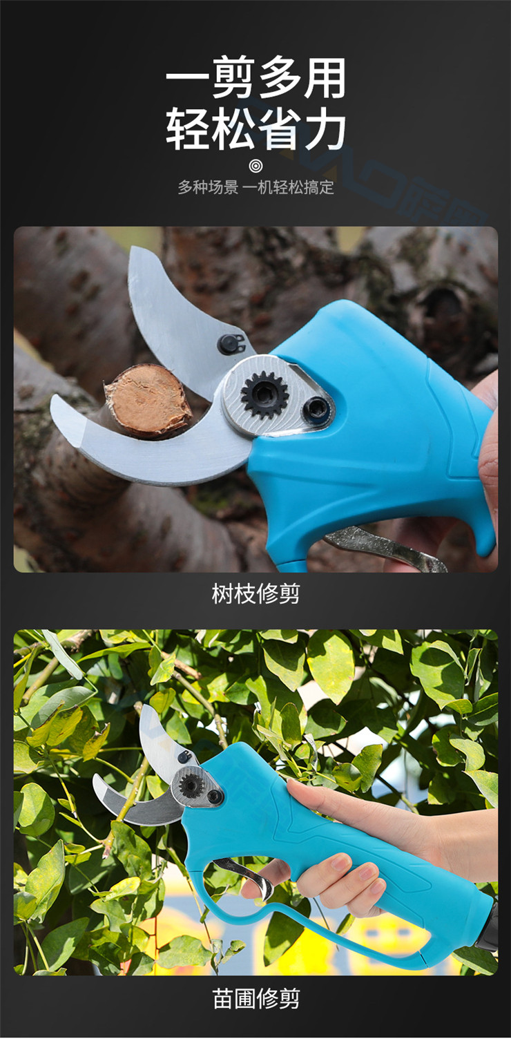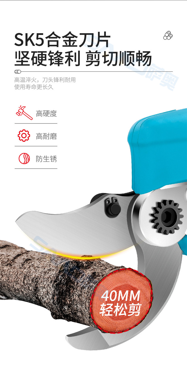 電動果枝剪刀剪切范圍:直徑25MM硬枝(硬枝:冬青、黃楊、檜柏、刺柏、紫薇、茶樹等等)至40MM軟枝(軟枝:葡萄枝類)