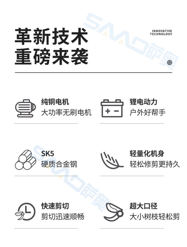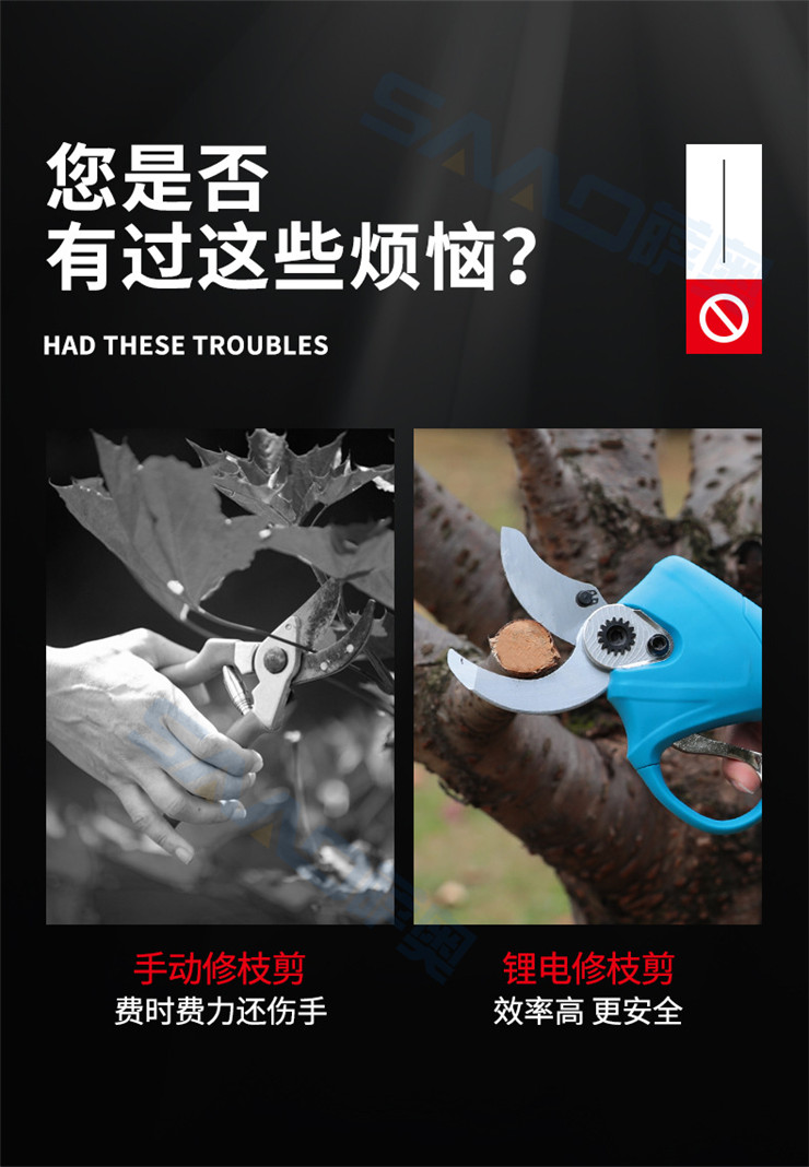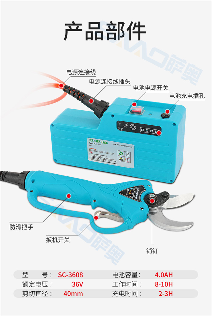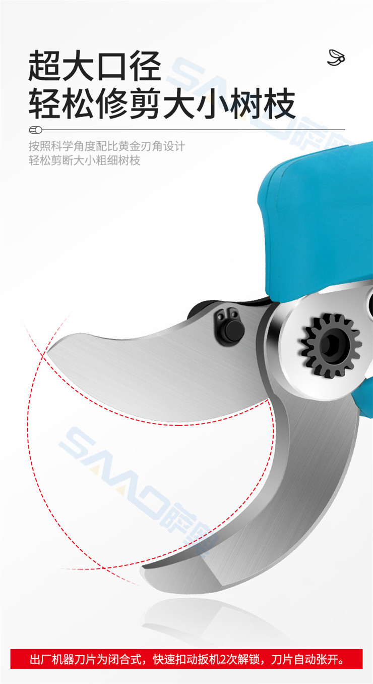 電動果枝剪刀剪切范圍:直徑25MM硬枝(硬枝:冬青、黃楊、檜柏、刺柏、紫薇、茶樹等等)至40MM軟枝(軟枝:葡萄枝類)