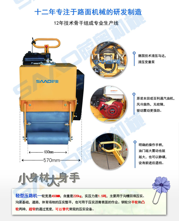 概述: 主要用于溝渠基礎(chǔ),道路,體育場地的壓實(shí)整平,也可用于壓實(shí)瀝青表面的作業(yè)。