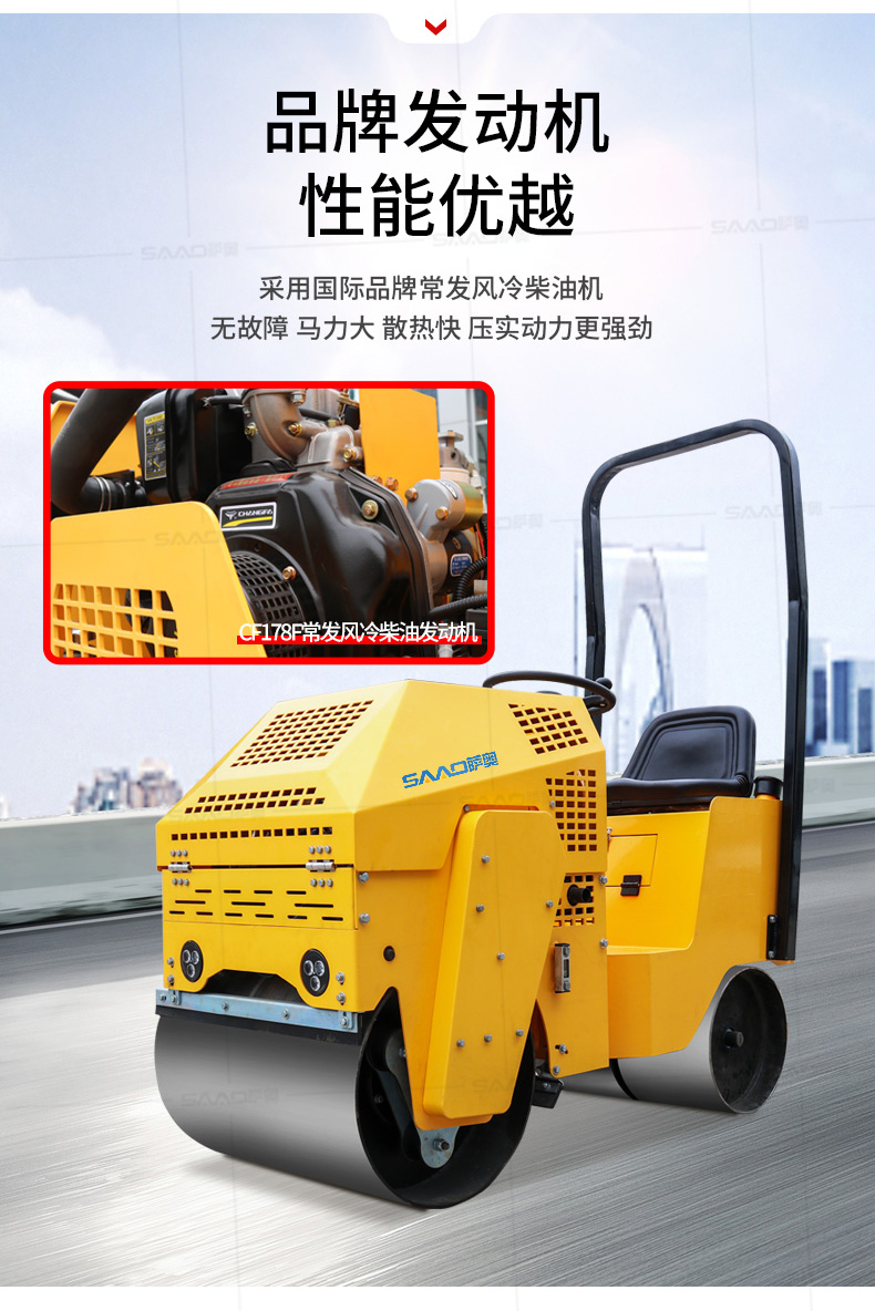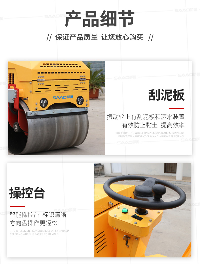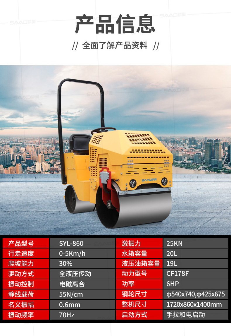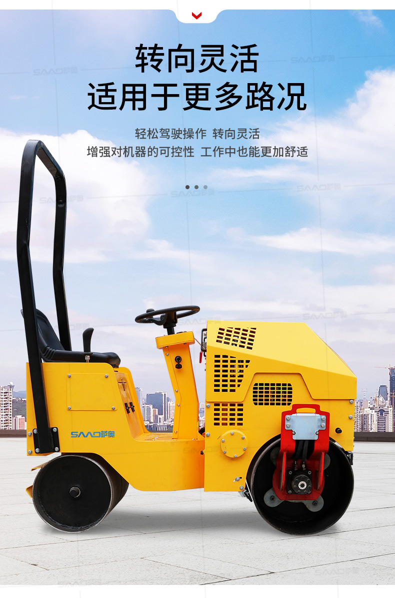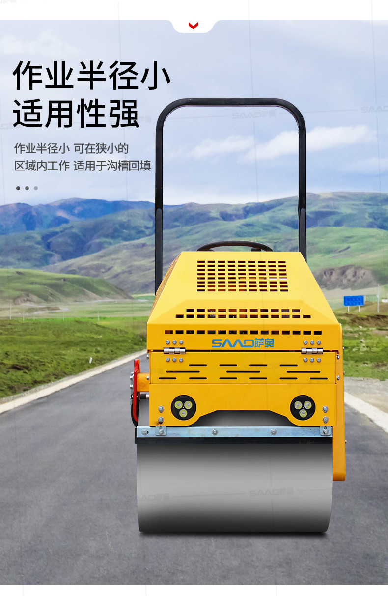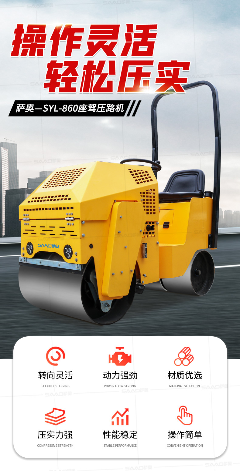 SYL-860座駕壓路機(jī)適用于各種溝槽沙土回填壓實(shí)、高層建筑地下室土方壓實(shí)、小區(qū)道路基礎(chǔ)壓實(shí)、各種草坪壓實(shí)、修修補(bǔ)補(bǔ)及各種小型工程的使用,解決了大型壓路機(jī)無法工作區(qū)域的壓實(shí)